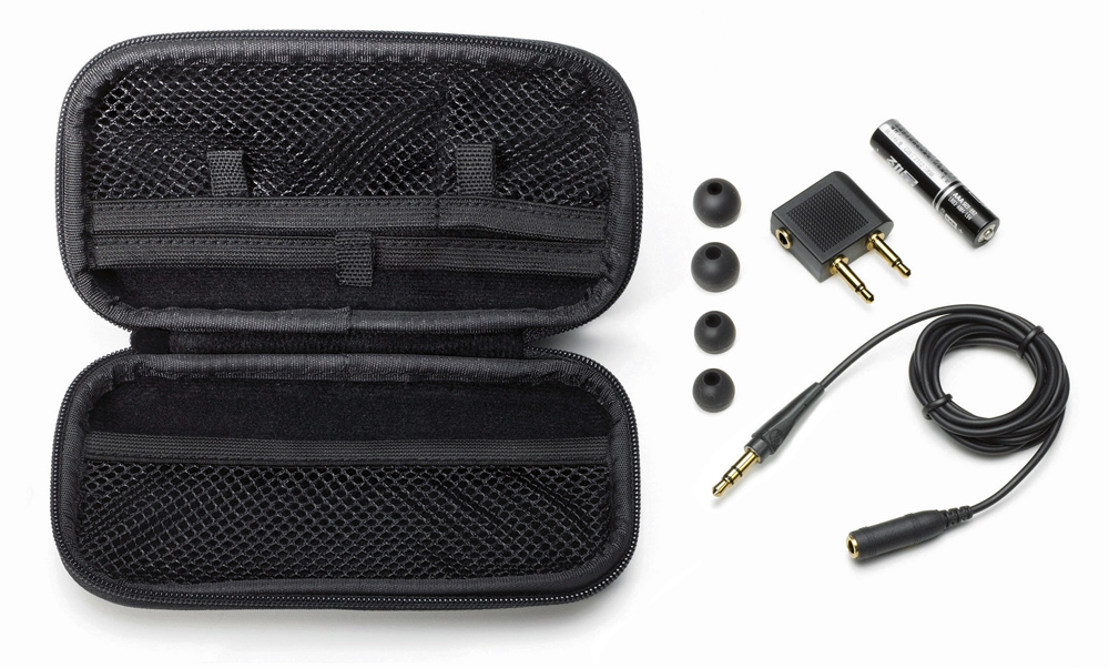 Moving into the packaging, we find a fair amount “extras” bundled with the earphones. We were pleasantly surprised with Audio-Technica’s forethought into all the accessories. Included with the ATH-ANC3 earphones is a 1.6 foot long (.5 meter) extension cable, cleaning tool, airline adapter, soft rubber tips, AAA battery, and a rather large nylon carrying case to store all the included goods. The rubber tips are softer than the ones included with most earphones and came in small, medium, and large sizes to suit various ears. We found these very comfy and enjoyable. For those that like storing their audio player in a backpack or near the belt-line, the 1.6 foot long extension cable will prove helpful. To further protect your earphones, Audio-Technica includes pre-inserted filters at the openings of the sound canals. This helps prevent dirt and debris from getting in. Should something manage to get in, the cleaning tool helps remove any earwax that builds up over time; I guarantee that it will be handy. The airline adapter will take the two mono lines from the airplane and combine them into stereo sound for the ATH-ANC3 earphones. Audio-Technica even includes a AAA battery so you can start enjoying the active noise cancelling abilities as soon as you open the box. The nylon case has internal storage nets for accessory organization. We even found that it’s the perfect size to carry your iPod Touch in addition to the ATH-ANC3 earphones.