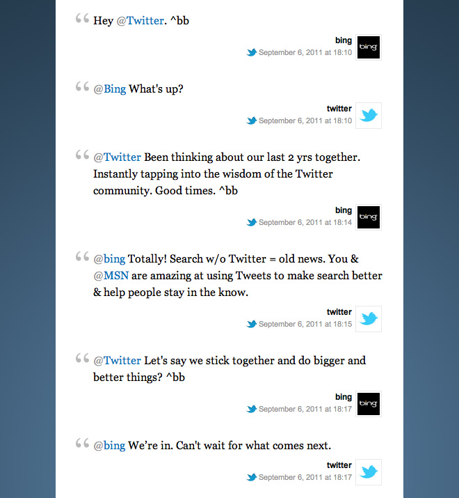Following a brief reflection of their steady two year relationship, Bing and Twitter continued to plan their future together. Carolyn Penner took the liberty of using Storify to compile the conversation, as pictured below.
