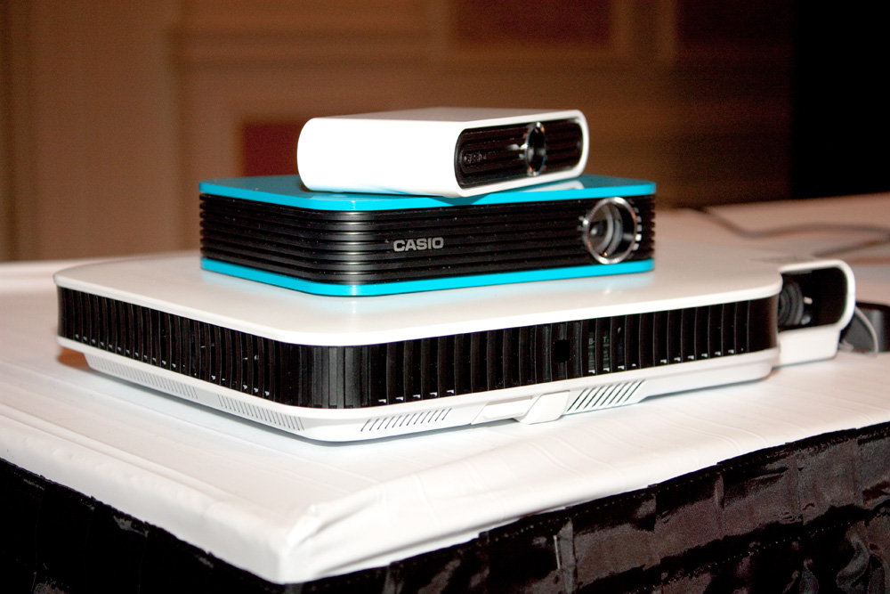 Casio also introduced a new series of compact, environmentally friendly projectors. These projectors are 1.5 inches thick and the size of a standard sheet of letter-sized paper, and weigh less than 5 pounds. Through the use of hybrid laser/led projection technology, the projector puts out up to 3000 lumens with improved clarity and color. What makes it environmentally friendly is the lack of a compressed mercury bulb. On top of that, the projector takes less power to run and without the need to replace a bulb or filter. The laser/led hybrid technology has an extended life; over 20,000 hours. That’s 7 years if you run the projector for 8 hours everyday. A pocket-sized projector featuring the same technology is also in development and may be available later this year.