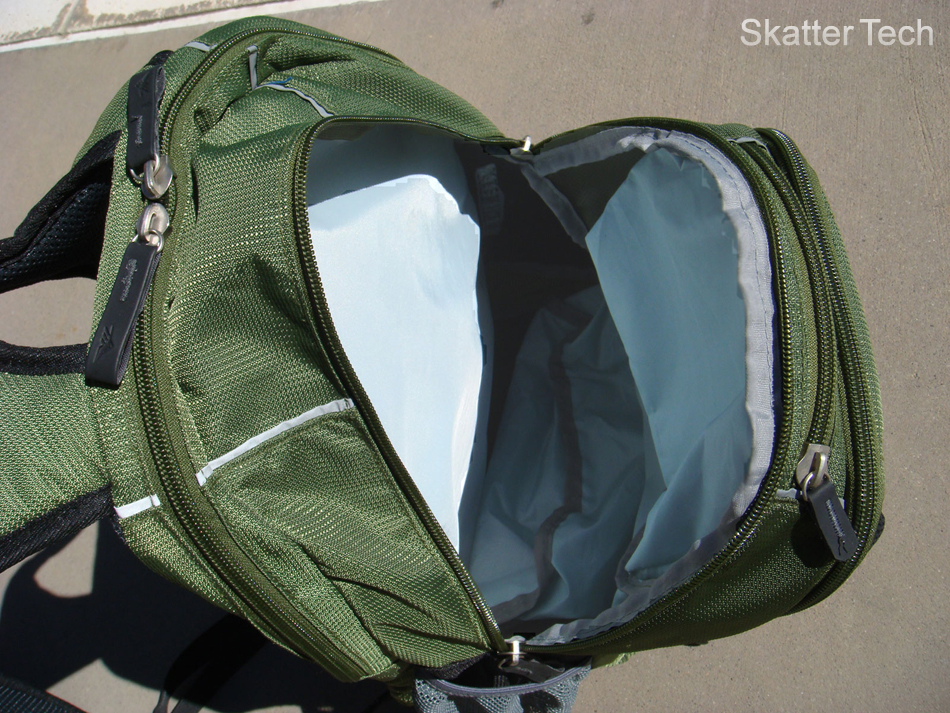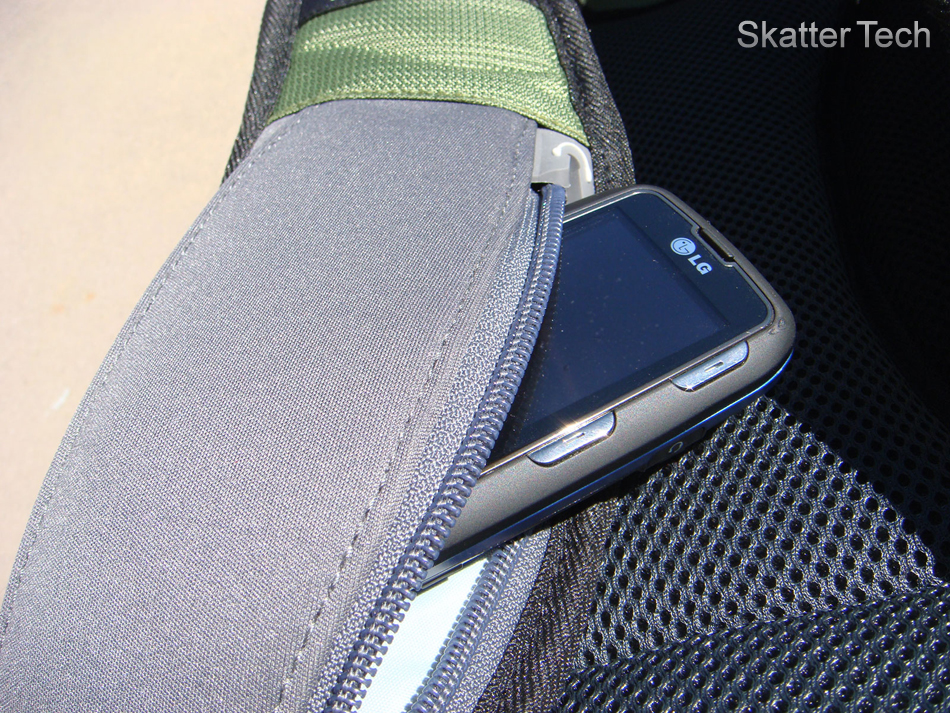 The High Sierra Grid also follows a conventional pouch layout. Located closest to the user is the laptop compartment. This pocket might seem like the main pocket, but is really just meant to hold your laptop and a small spiral notebook or two. Keeping along with the “any laptop compartment can double as a hydration bladder compartment” ideal, this separation of the main pocket and laptop compartment is a great idea as should some water escape from the bladder, it won’t soak your contents in the main pocket. Moving out, we see the main compartment. While not huge, this main compartment is sized normally to carry an everyday load. It’s interesting to see the lower front pocket expand into the bottom of the main compartment though as that could either limit how much you put into the main compartment, or would severely limit the space of the lower front pouch. A small accessory pocket is located up top next. This is a very convenient pouch and is greatly appreciated. The following pouch is the front organizer. High Sierra left a good amount of room here for your writing utensils and gadgets. Unfortunately the key hanger seems very cheaply made and doesn’t seem as if it will last long. The most interesting pouch is the front lower pouch. It has a good amount of room once expanded and seems like the ideal place to stash your lunch or piece of clothing. Unfortunately it intrudes on the main compartment’s inner space and is thus severely hindered. One main difference between the High Sierra Grid and the other packs was the inclusion of the carry handle on the shoulder straps. This method has a sleeker look, but led to a few bugs later. Located on the shoulder straps are a mesh elastic pouch for your keys or cell phone and a zippered mp3 player pouch. The mp3 pouch isn’t very large and the thought of cramming an ipod touch in there is a long shot. It does however work well for flatter cell phones and I ended up swapping spots (cell phone in mp3 pouch, mp3 player in cell phone pouch) frequently. Overall I’d say the Grid contains a very functional and convenient design for everyday use.