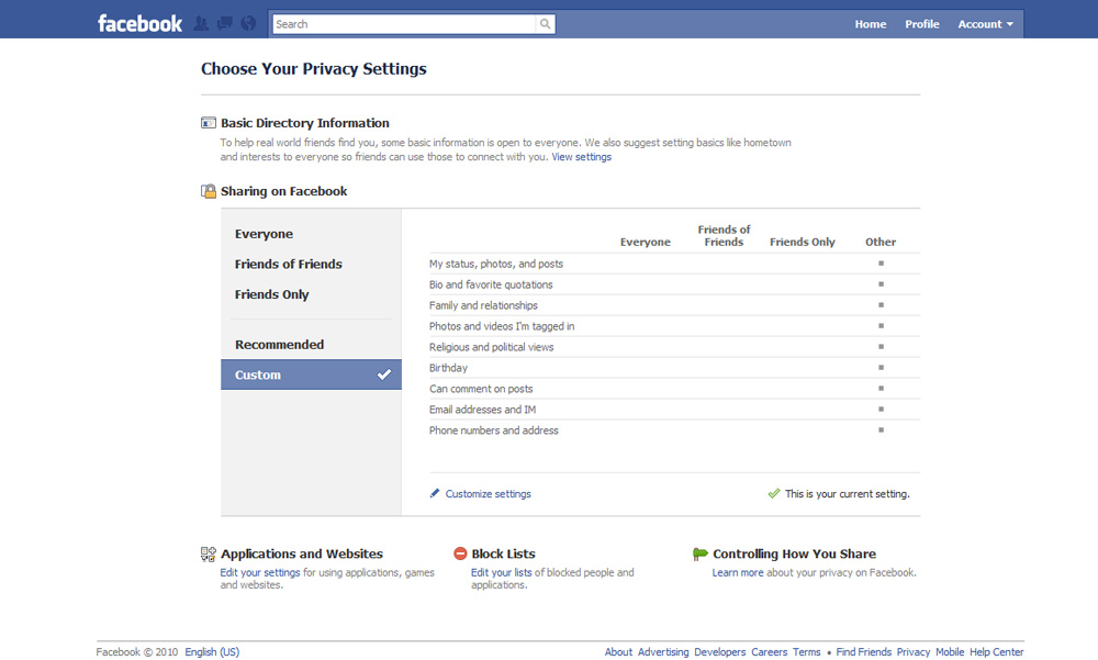 As it stood before, Facebook’s privacy settings were cluttered with many confusing and highly specific options. On the other hand, the new settings are simple and intuitive. Any changes users make to their privacy settings are now displayed on a simple grid, which should make managing information a lot easier. The idea behind the change is to make it practical for users to control what appears on their profile page. At first glance, it may seem that Facebook is dumbing itself down by limiting options; however, they have still left their granular settings intact for tech savvy users. I personally would rather switch to the new simple control setting which offers controls to what information gets displayed with just the click of a few buttons.