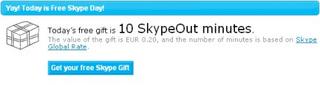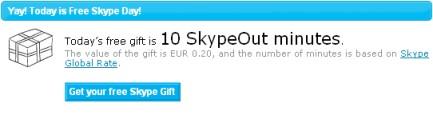 Today, 07/11/05, is the first Free SkypeOut Day! To get your free 10 mins of calls just logon to the “My Account” page throught the link below and then click on “Get Your Free Skype Gift.” After a few mins log into Skype and you should have 10 mins of calling credit. This will allow making as many calls as you wish to anywhere in the world. This offer will end at the end of the day so go signup as soon as possible. If you do get this offer you will be allowed to save this credit for as long as you wish.