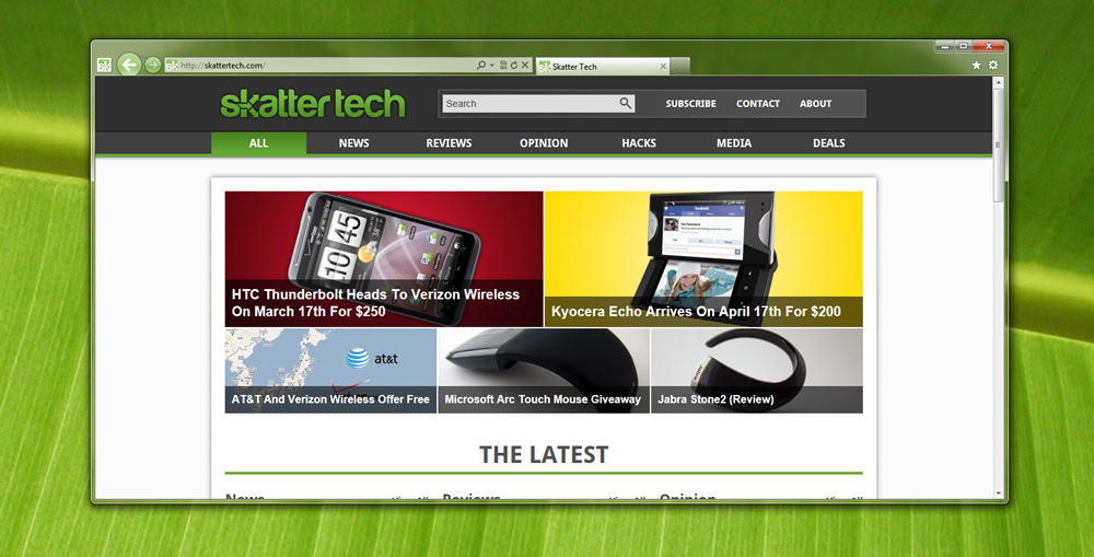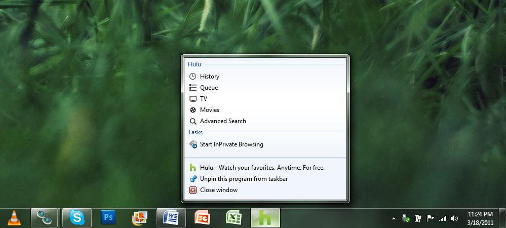 Like Windows 7 optimized programs, websites pinned to the taskbar have a list of quickly accessible tasks. For instance, pinning Hulu offers quick links to head to various sections of the website. The upcoming update for Skatter Tech will add quick access to each of our six hubs.