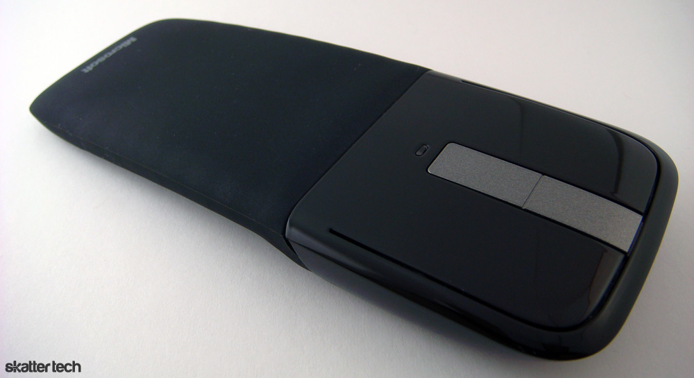 The Arc Touch Mouse runs on two included AAA batteries which stow up in front. Snapping the mouse into a curved shape from the original flat form factor switches the device on and a blue LED confirms it. There are buttons for left and right-click along with a touch strip for scrolling and middle click. The mouse notably lacks a back and forward button, which is quite helpful for browsing the web.