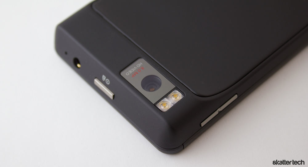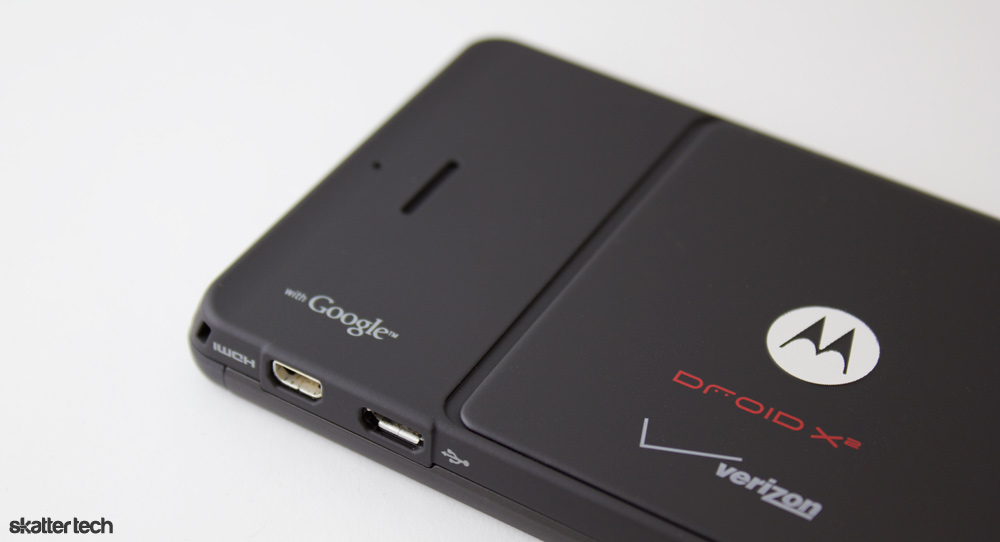 Additional features include the same four rectangular Menu, Home, Back, and Search buttons beneath the display that were on the Droid X, a 4.3-inch display that dominates the phone (more on this later), a micro-USB port and HDMI port on the left spine, a chrome volume rocker on the right spine, and a 3.5-mm headphone jack and power button on the top of the phone. The removable 1,540 mAh and included 8 GB microSD card are hidden behind a rear slide-off panel held firmly in place. The Droid X2 also sports an 8 megapixel rear camera with dual-LED flash, 3G mobile hotspot, 720p video recording, 512 MB of RAM, Wi-Fi 802.11 b/g/n, and 8 GB of internal memory for apps.